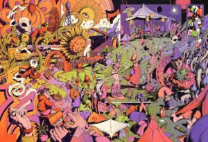 “Sobriety and Ecstasy” was the title of the February 2025 Harper’s. It’s corresponding feature story was entitled “High and Dry – Sobriety and transcendence at Bonnaroo”. This picture was the cover art. I think Barrett Swanson is either a vocabulary savant or an idiot who used Google to look up 5-dollar synonyms for 50-cent words. How many of the following words do you know? Some I did not know at all; some I had a vague recognition of, but I was helped by context.
